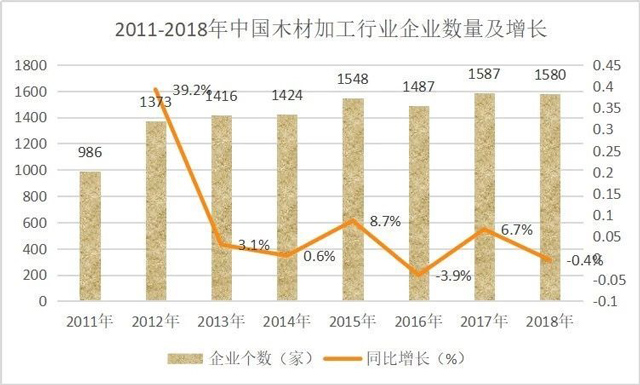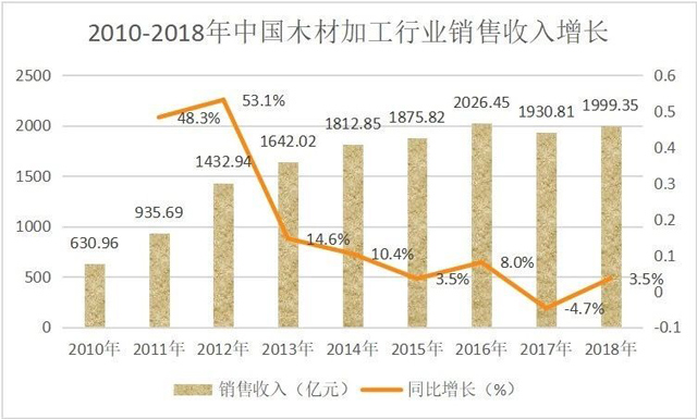 改革開放以來,經(jīng)過40年的發(fā)展,我國木材加工行業(yè)已經(jīng)取得長足發(fā)展,2018年銷售規(guī)模已達(dá)1999.35億元,規(guī)模以上企業(yè)數(shù)量達(dá)1580家。在此背景下,鋸材、木片、人造板、木制品等細(xì)分市場也有明顯發(fā)展。