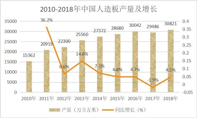 目前,中國人造板產(chǎn)品產(chǎn)量占全球人造板總產(chǎn)量的50-60%。2017年,中國人造板總產(chǎn)量已達(dá)29486萬立方米,但受政策、市場等影響,同比上年減少1.85%,為近二十年來初次降低。