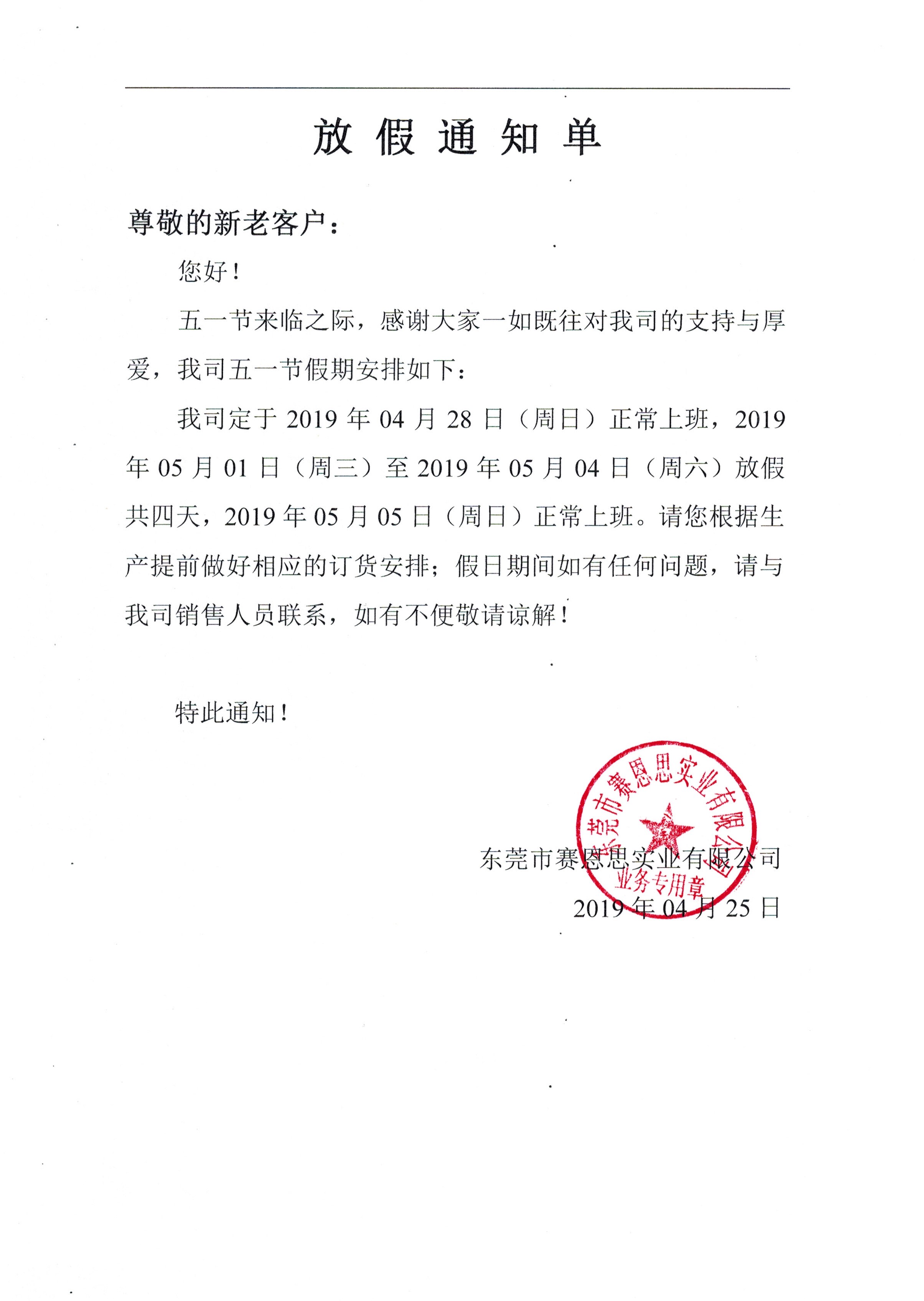 五一勞動節(jié)又到了,我司放假時(shí)間如下,請各位新老客戶記得提前備好貨哦,預(yù)祝大家節(jié)日快樂!